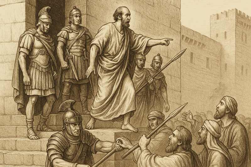 设想一下这个场景:保罗,这位曾经逼迫教会的凶手、如今却为主舍生忘死的使徒,全身被两条铁链紧紧捆锁着,他站在通往罗马兵丁营楼的台阶之上,缓缓举手向那一群曾想要他命的同胞挥手示意。令人惊奇的是,圣殿前的喧哗和怒吼忽然平息了,嘈杂愤怒的人群骤然安静了… 他们在一片肃静中等待着,等待这位已经成为罗马囚犯的人对他们说话。