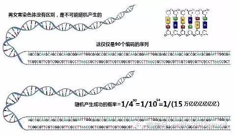 如果男人的一条染色体有这样一段编码,在女人身上也有相同的一条染色体,两者90个DNA编码的序列完全相同,这可能是随机形成的呢?答案是绝不可能!