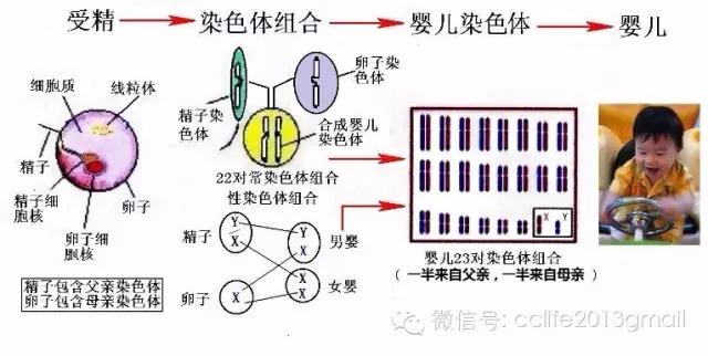 卵子包含了22条常染色体和一个性染色体X;精子包含了22条常染色体和一个性染色体X或者Y,如果这个精子包含的是Y,将出生男孩,包含X就一定是女孩。可以说人是DNA编码编出来的,DNA编码全部是包含在染色体和线粒体之中。
